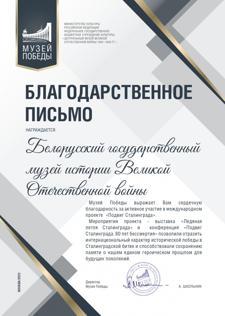 В феврале 2023 года в Доме Москвы в Минске было проведено совместное мероприятие «Вехи Великой Отечественной войны. Помним и гордимся!», приуроченное к 80-летию победы в Сталинградской битве. Организатором проекта выступил Департамент внешнеэкономических и международных связей города Москвы. Юбилейное мероприятие провели сотрудники нашего Музея. Они еще раз напомнили молодежи о героизме наших прадедов, о нашей общей истории.