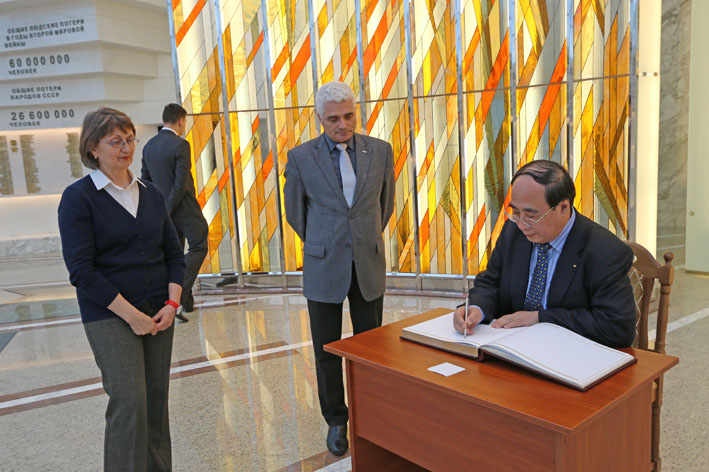 Руководители делегации оставили запись в Книге почётных посетителей. В краткой заключительной беседе с руководством Музея высокие гости отметили, что на сегодняшний день Белорусский государственный музей истории Великой Отечественной войны является одним из лучших в мире. Они выразили благодарность в адрес белорусского народа за память о миллионах погибших в борьбе с коричневой чумой – фашизмом – и отметили большой вклад Беларуси в Великую Победу, принесшую мир человечеству.