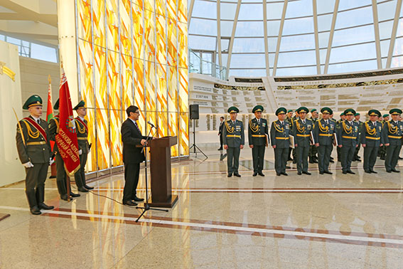 В Зале Победы офицеры-пограничники сфотографировались с Чрезвычайным и Полномочным Послом Республики Казахстан в Республике Беларусь Ергали Булегеновым и руководством Погранкомитета Республики Беларусь и военного учебного заведения, а также возложили цветы к обелиску «Минск – город-герой».