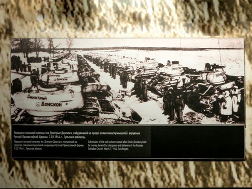 В зале музея «Коренной перелом в ходе войны. Советский тыл» экспонируется фото сюжетное – «Передача Красной Армии танковой колонны им. Дмитрия Донского, построенной на средства, собранные православной церковью. 7.03.1944 г.»,