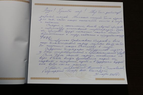 Митрополит Минский и Заславский, Патриарший Экзарх всея Беларуси Павел оставил запись в Книге почетных гостей. В ней говорится: «Сердечно благодарю сотрудников музея за ваш миротворческий и просветительский труд! Сила Духа нашего народа, основанная на вере в Бога, всегда вдохновляла людей на подвиги и созидание. Пусть и в будущем она будет вести нас по жизни!».