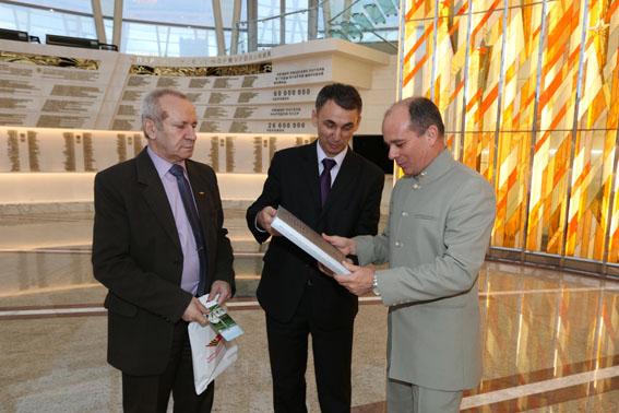 В Зале Победы директор музея генерал-майор запаса Николай Скобелев вручил вице-адмиралу Хосе Боггиано научно-популярное издание «Белорусский государственный музей истории Великой Отечественной войны».