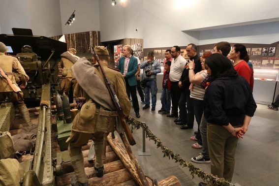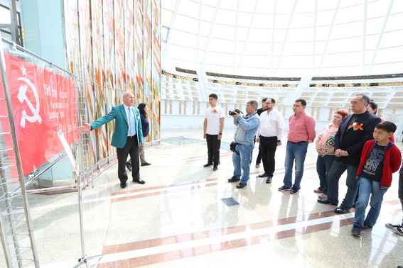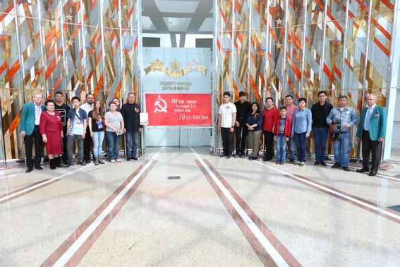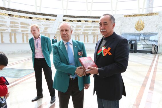 Члены кыргызской делегации сфотографировались в Зале Победы музея у святыни Великой Победы. Помощник директора музея Николай Дмитриевич Шевченко вручил директору общественного фонда «Агитбригада» Кериму Шайманову книгу «Победа одна на всех» (вклад союзных республик СССР в завоевание Победы в Великой Отечественной войне 1941 – 1945 гг.).