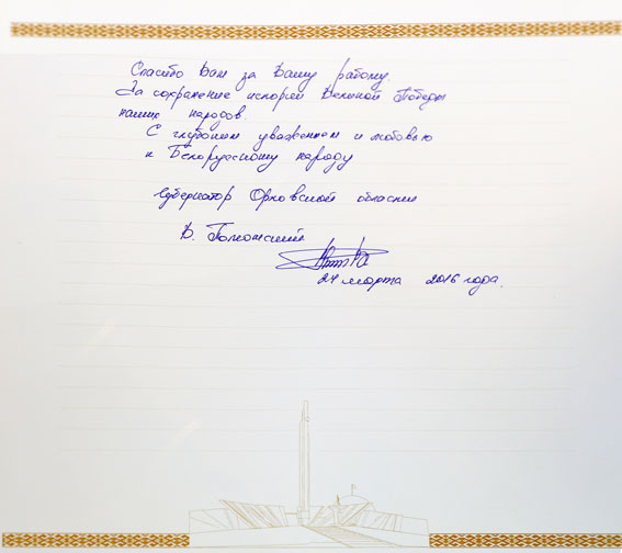 Белорусский государственный музей истории Великой Отечественной войны посетила делегация Орловской области во главе с губернатором Вадимом Владимировичем Потомским. Члены делегации находились в Республике Беларусь с официальным визитом. Губернатор В.В. Потомский родился в семье военного, в 1993 г. окончил Санкт-Петербургское высшее зенитно-ракетное командное училище. С 1993 до 1998 гг. проходил военную службу в Ленинградском военном округе. Имеет воинское звание – подполковник.