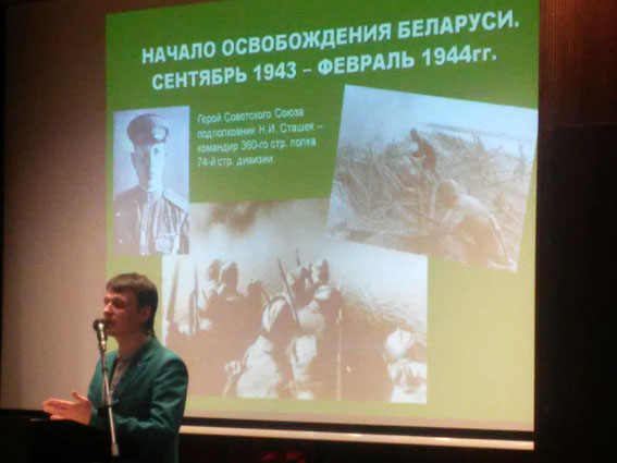 После экскурсии научным сотрудником В. Костюковичем в конференц-зале музея прочитана лекция с презентацией и показом музейных экспонатов. Используя архивные документы, материалы фондов музея Владимир убедительно показал роль Красной Армии, партизанских бригад и отрядов в освобождении народа Беларуси от захватчиков. Это стало возможным благодаря беспримерному мужеству, героизму и самопожертвованию сотен тысяч воинов действующей армии и белорусских партизан, многие из которых отдали свои жизни во имя Победы над врагом.