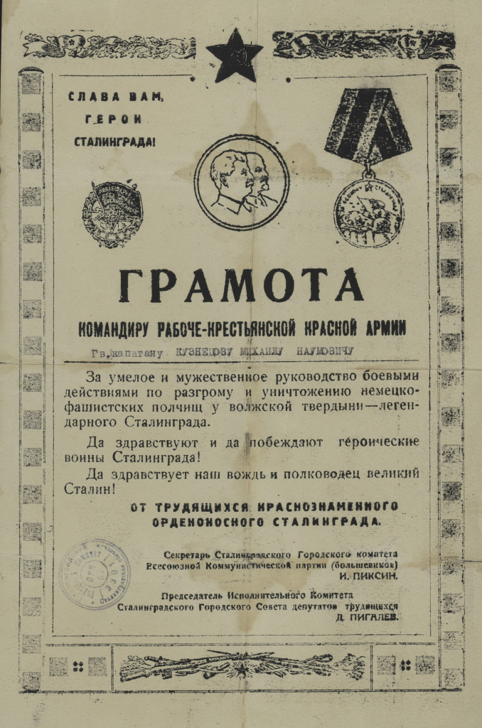 В фондах Музея хранится грамота, которой гвардии капитан М.Н. Кузнецов был поощрен Исполнительным комитетом Сталинградского Городского Совета Депутатов трудящихся за умелое и мужественное руководство боевыми действиями «по разгрому и уничтожению немецко-фашистских полчищ у волжской твердыни – легендарного Сталинграда!».