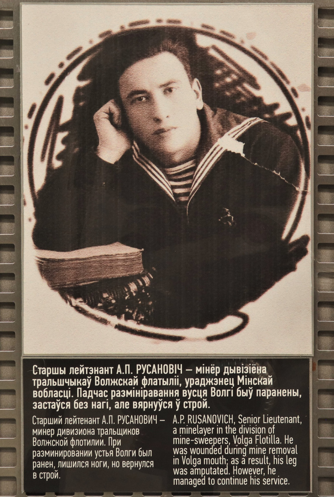 Русанович Александр Павлович, уроженец деревни Петровщина Минского района, нес службу на Черном и Азовском морях. Во время Сталинградской битвы служил в Волжской речной военной флотилии. В 1943 г. флотилия занималась разминированием фарватера Волги: на участке от Астрахани до Саратова противник установил несколько сотен магнитно-акустических мин. В мае 1943 г. реку готовили к навигации, и во время траления минный тральщик, на котором служил старший лейтенант А.П. Русанович, подорвался на мине. Двадцатичетырехлетний минер чудом остался жив.