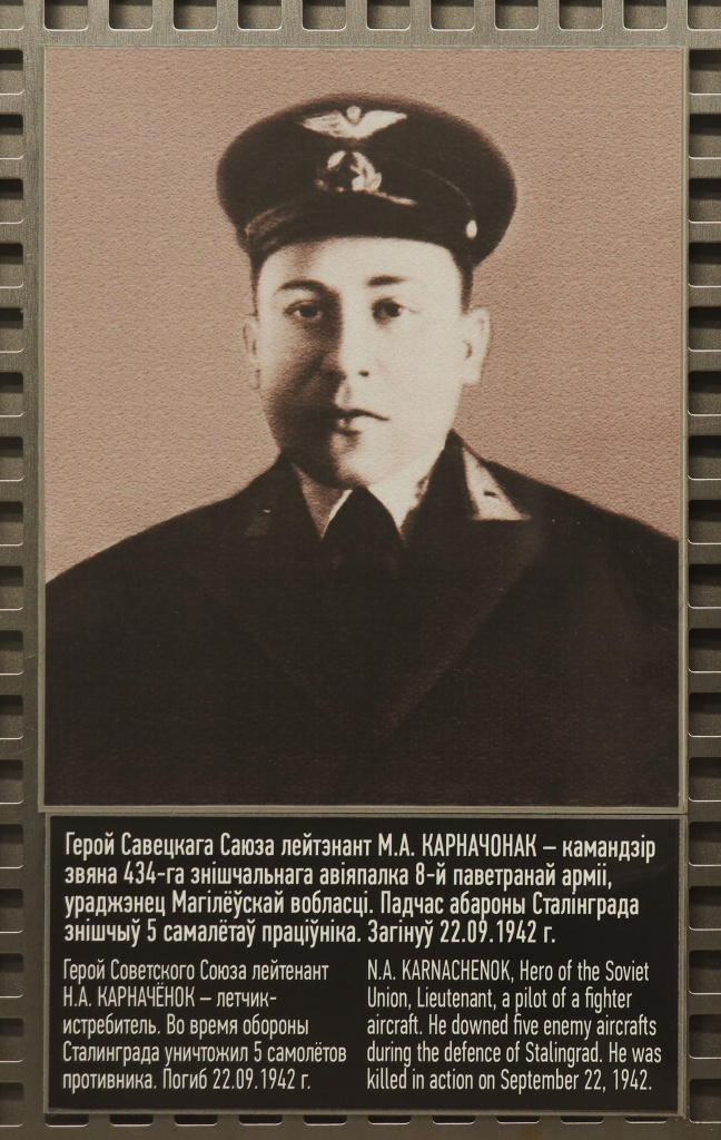 Карначёнок Николай Александрович, уроженец деревни Борки Шкловского района Могилевской области, служил старшим лейтенантом, был командиром звена 434-го истребительного авиаполка 8-й воздушной армии Сталинградского фронта. С 1 июля 1941 г. воевал на Юго-Западном, Сталинградском фронтах. В ходе оборонительных боев за Сталинград летчик делал в день по 6–7 боевых вылетов, уничтожил 7 бомбардировщиков противника. На его счету 349 боевых вылетов и 10 сбитых самолетов. Погиб Н.А. Карначёнок 22 сентября 1942 г. Звание Героя Советского Союза присвоено ему 23 ноября 1942 г. посмертно.