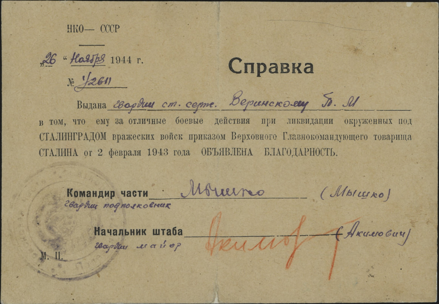 В 1943 г. гвардии старший сержант П.М. Веринский за отличные боевые действия при ликвидации окруженных под Сталинградом вражеских войск получил благодарность от Верховного Главнокомандующего И.В. Сталина.