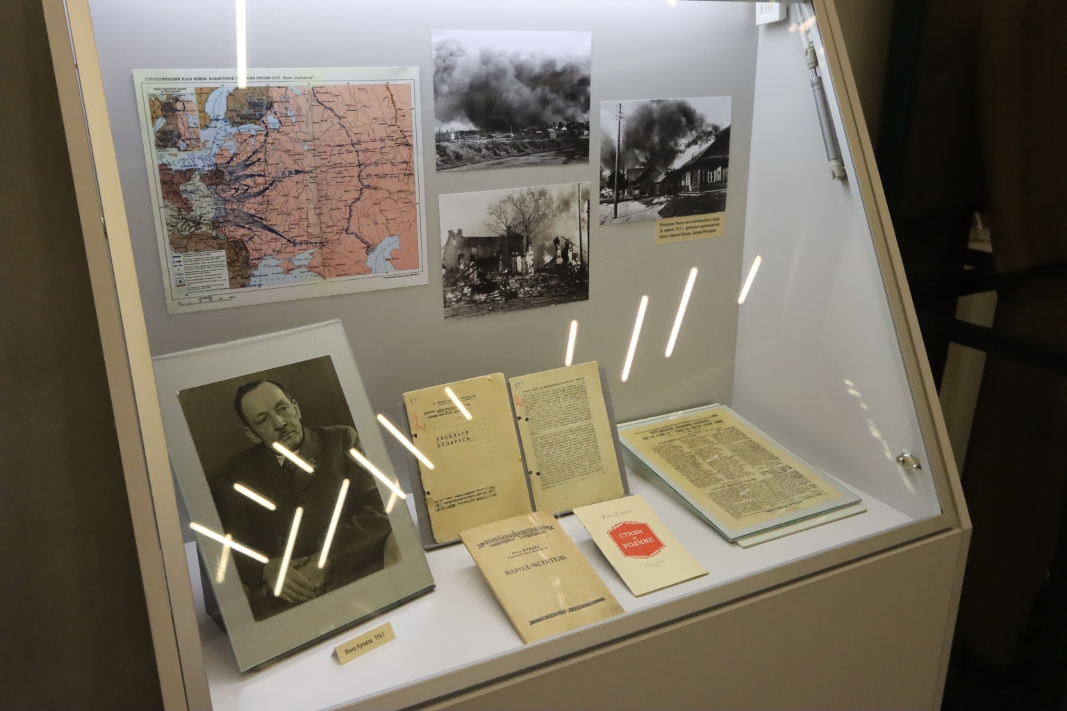 Унікальныя рарытэты са збораў Дзяржаўнага літаратурнага музея Янкі Купалы і Беларускага дзяржаўнага музея гісторыі Вялікай Айчыннай вайны прадстаўляюць жыццёвы и творчы шлях першага народнага паэта Беларусі ў гады Вялікай Айчыннай вайны – неад’емную часціну агульнага лёсу народа нашай краіны.